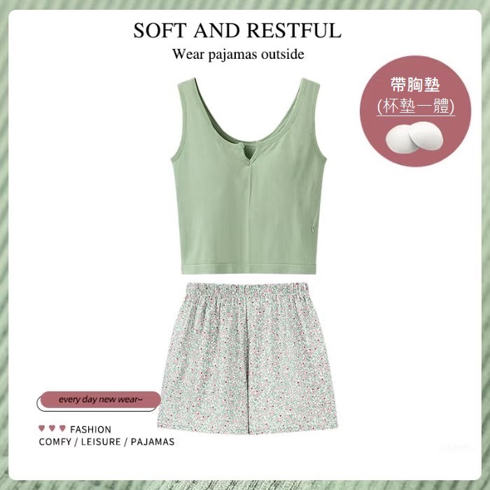 小碎花帶胸墊無袖短褲家居服-綠2XL