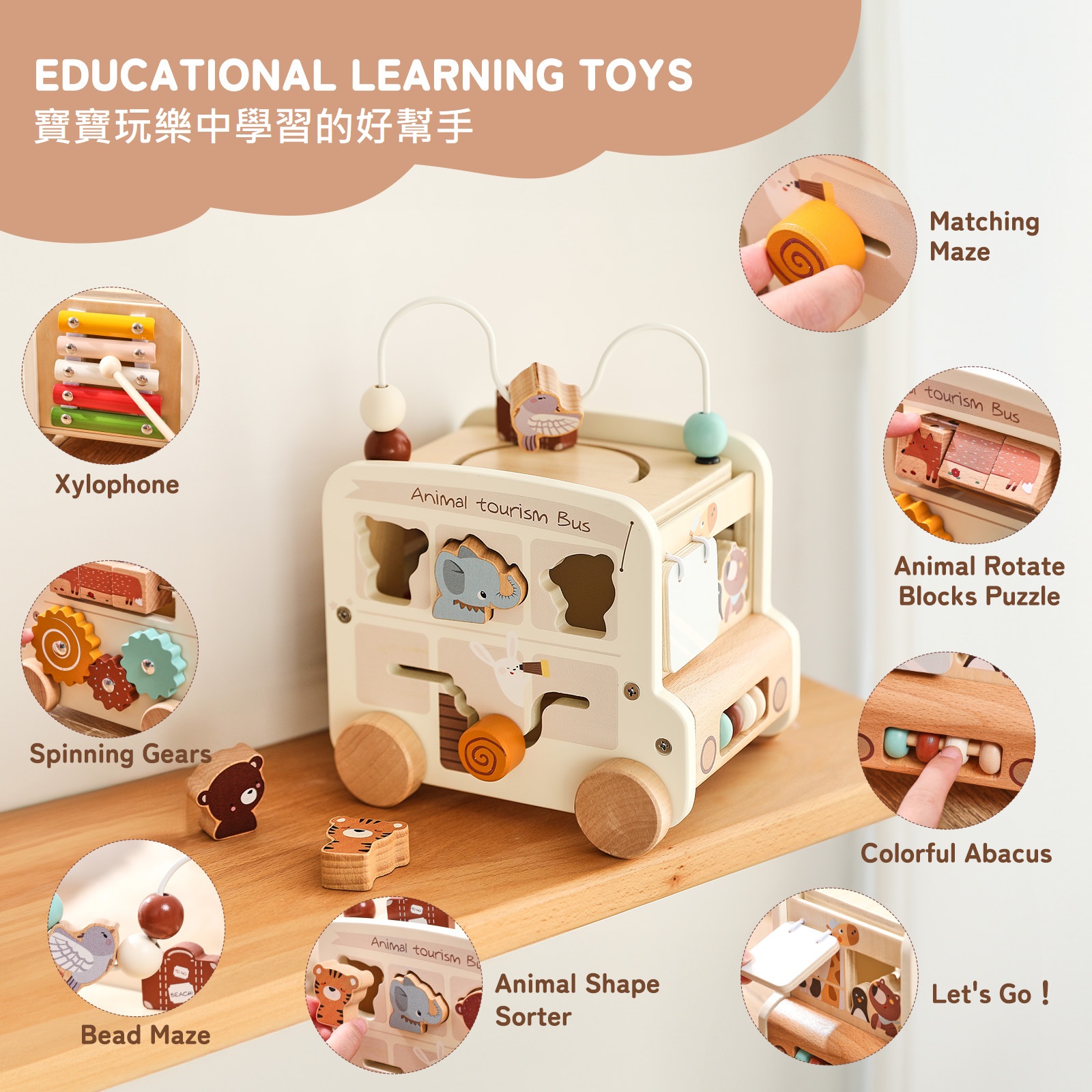 兒童木製益智蒙氏巴士車- 五合一米色