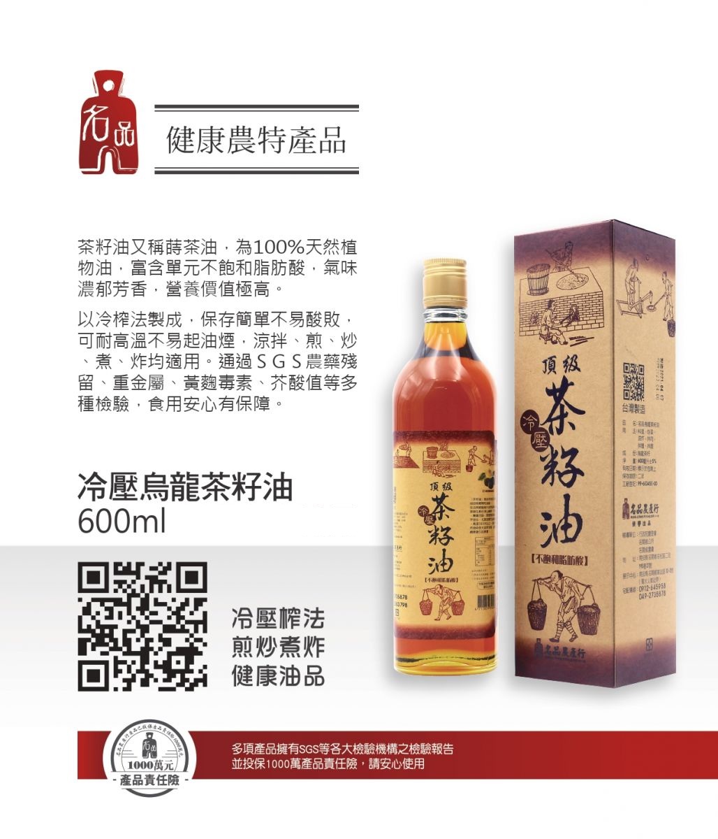 【名品農產行】烏龍茶籽油600ml*2瓶+苦茶籽油600ml*2瓶《需選宅配》