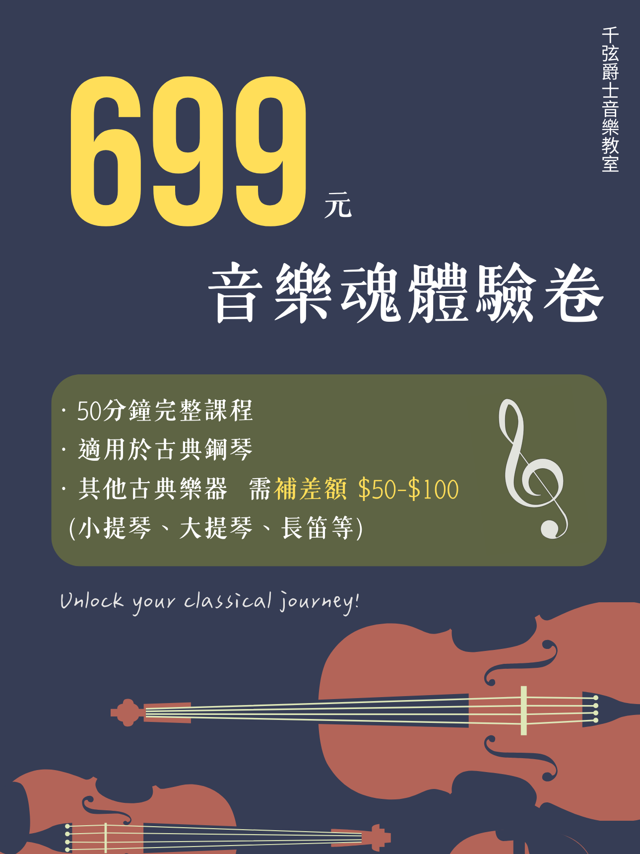 其他樂器(小提琴、大提琴、長笛等)需補差額 $50–$100